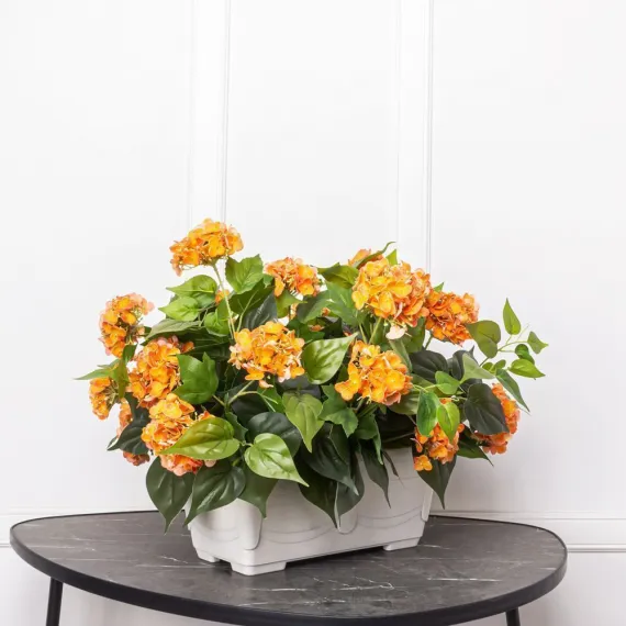 Ц621-3 Композиция искусственная Гортензия 21 голова (латекс) в балконном кашпо 35см, оранжевая