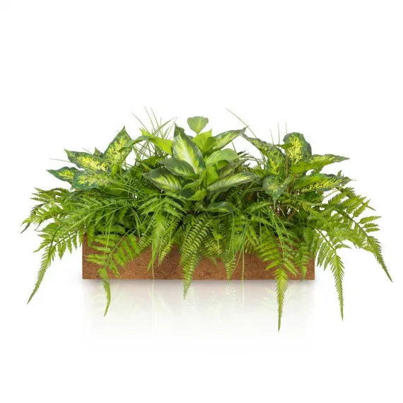 К328-1 Композиция искусственная Зелень микс с калатеей в кокосовом боксе 60х13хh13см