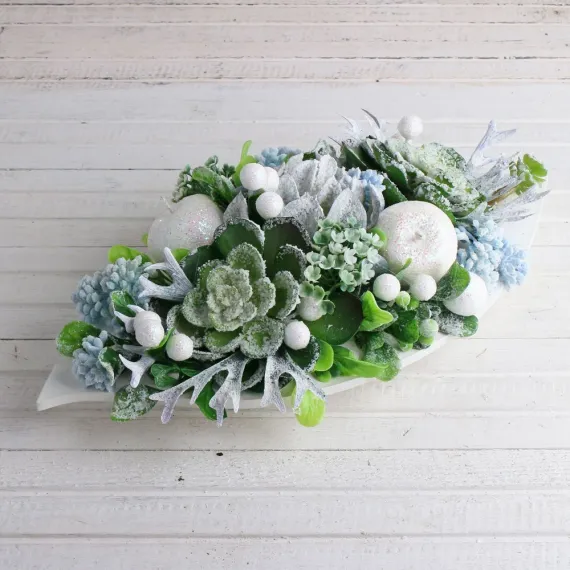 СКЛ04 Суккулкенты НГ Композиция Снежная в декор. лодке 37*17