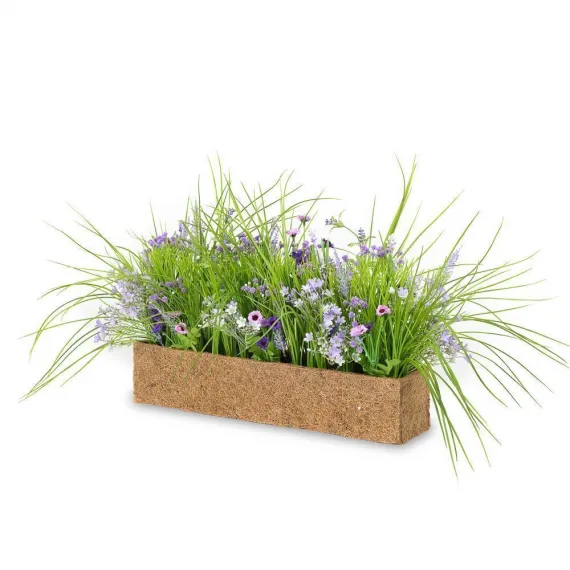 ТД085 Композиция искусственная Разнотравье с цветочками в кокосовом боксе 50х10хh10см, фиолет