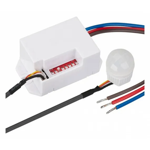 ИК-датчик (IP20) отделен от основного блока (IP20), совмещенный с датчиком освещенности, регулировка времени (5с – 8 мин), расстояния (до 6 м при монтаже на потолок, до 8 м при монтаже на стену), освещенности (10-2000 лк), угол обзора: 100° в вертикальной