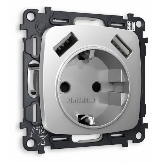 Розетка с заземлением и 2хUSB type A, без рамки Ambrella Volt Quant MO409010